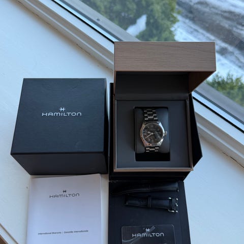 Kjøpt ny fra autorisert forhandler Ditur.dk i januar 2025. Det følger derfor fortsatt med ca. 1 år garanti. Ditur.no er en offisiell Hamilton-autorisert forhandler, i motsetning til for eksempel Urverket.no.