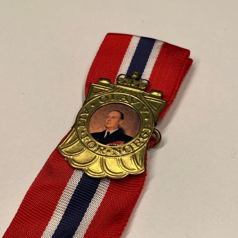 Kong Olav 17 mai nål . Selve sløyfen er falmet. 15 cm med sløyfe.