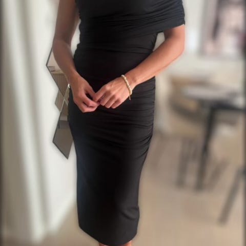 Elegant midikjole med åpne skuldre og drapering på byste og midje