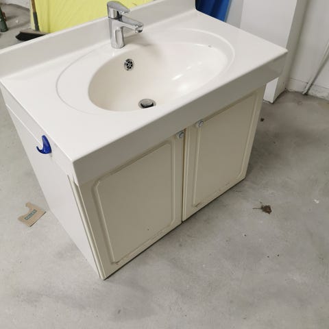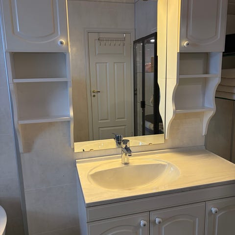 Baderomsinnredning 50x90 cm, med integrert servant og speilskap i hvit farge. Underdelen har tre skapdører med oppbevaringsplass. Servanten er nedfelt i benkeplaten og har ett-greps blandebatteri. Overdelen har speil og et lite skap med hylle for oppbevaring av baderomsartikler. Egnet for montering på bad eller vaskerom der det er behov for kombinert servant og oppbevaringsløsning.