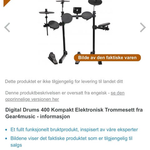 Elektronisk trommesett med flere pads og cymbaler montert på stativ. Settet inkluderer trommestol, trommestikker, fotpedal og hodetelefoner. Egnet for øving og spilling i hjemmemiljø der det er behov for lavere lydnivå enn med akustisk trommesett.