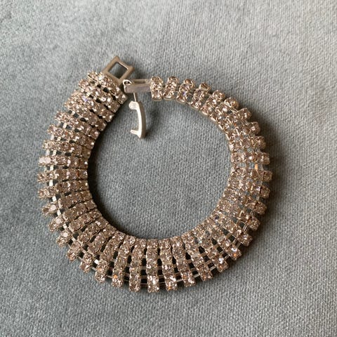 Armbånd i sølvbelagt metall med klare krystaller. Armbåndet består av en rekke firkantede krystaller som ligger tett i tett langs hele lengden. Det har en enkel lås som festes i enden av lenken. Armbåndet har en fast lengde med klassisk uttrykk.
