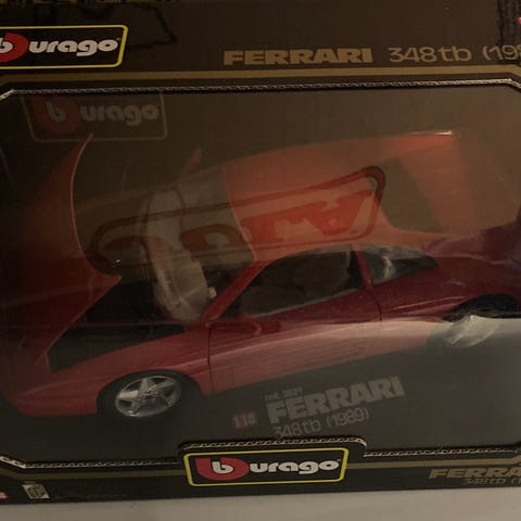 Bburago Ferrari 348 TB modellbil i rød farge. Modellen leveres i original eske med gjennomsiktig plastvindu. Bilen har detaljer som åpnbare dører, lyse interiørdetaljer og gummilignende dekk. Egnet som samlerobjekt eller utstillingsmodell for bilinteresserte.