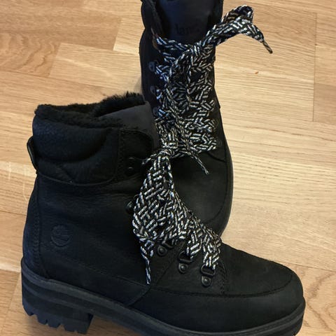 Lite brukte Timberland vinterstøvler i størrelse 39. Høye støvler i brun farge med kraftig såle og snøring foran. Egnet som varme og robuste vintersko til hverdagsbruk og utendørsaktiviteter i kaldt vær.