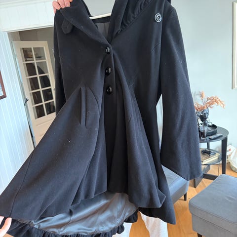 Svart kåpe Anne Klein i 60% ull og 40% viskose. Fôret er 100% poliester.