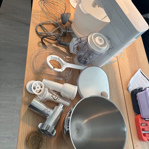 Kenwood Major Classic kjøkkenmaskin KM806 med to boller og tilbehør. Pakken inkluderer rustfri stålbolle, plastbolle, blenderkanne i glass, kjøttkvern, visp, deigkrok, K-visp og diverse andre redskaper. Det følger også med brukermanualer og dokumentasjon fra Kenwood. Egnet til elting av deig, pisking, røring, blending og kverning av kjøtt og andre råvarer i matlaging og baking.