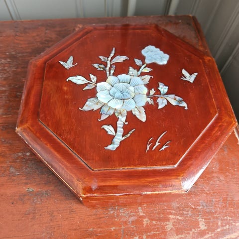 Flott smykkeskrin i tre. Det måler ca 25x17x16cm. Noen sprekker i treverket under uten at det går utover funksjon. Ellers litt slitasje her og der. Pent for alderen.