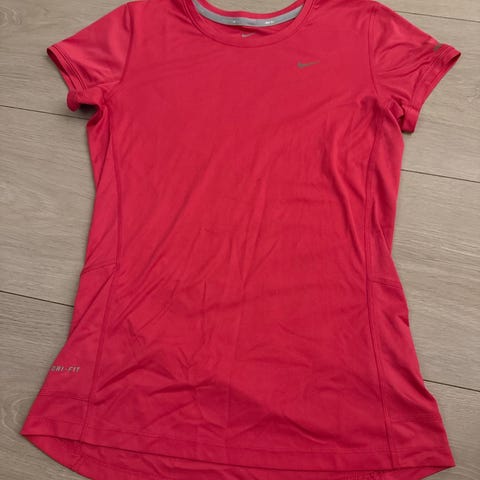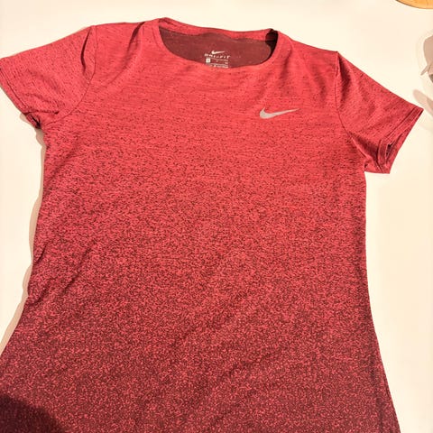 Nike Dri-Fit løpetrøye for dame i størrelse S. T-skjorte med kort erm, rund hals og lett teknisk materiale som transporterer fuktighet bort fra kroppen. Rosa/rød melert farge med liten Nike-logo på brystet. Egnet til løping og annen trening innendørs og utendørs.