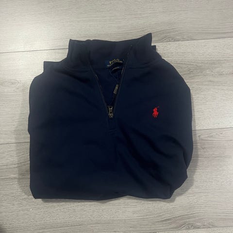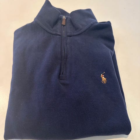 Selger en vintage quarterzip i navy, størrelse L.