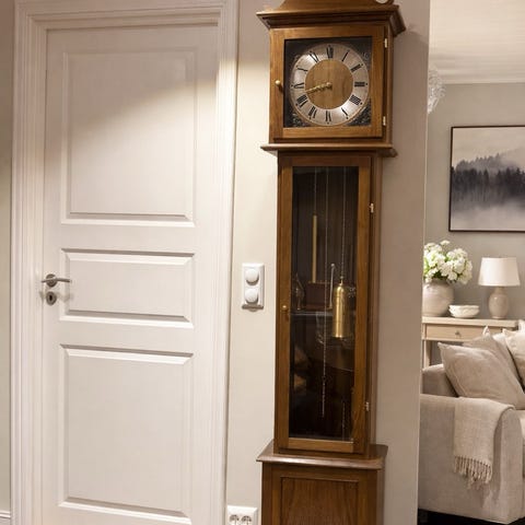 Gulvur i hvitmalt tre med klassisk utforming. Klokken har stort rundt urskivehus øverst med messingfarget urskive og romertall. Midtseksjonen har dør som kan åpnes, med innvendig pendel og lodd. Nederst har gulvuret en bred sokkel med dekorfelt. Passer som funksjonell klokke og som innredningselement i stue, gang eller andre oppholdsrom.
