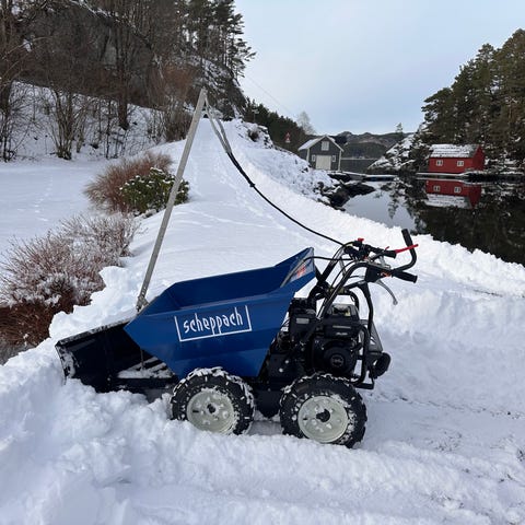 Minilaster med snøskuffe egnet for rydding og håndtering av snø på gårdsplasser, parkeringsområder og lignende uteområder.