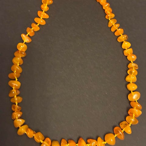 Baltisk rav halskjede. Halskjedet består av ravbiter tredd tett i tett langs hele kjedet. Fargen er varm oransje/brun, Lengden fremgår av bildet med målebånd.