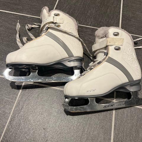 CCM 52 skøyter for barn i størrelse 36. Skøytene er svarte med hvite detaljer og tradisjonell snøring. Overdelen er i syntetisk materiale med polstring rundt ankel for støtte og komfort. Stålskinne under sålen gir stabilitet på isen. Egner seg til generell bruk på is, som lek og enkel trening.