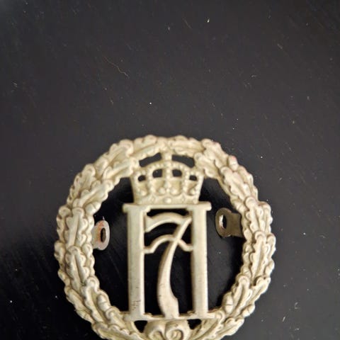 Sett med tre norske militære metallmerker gor bæret med Olav V-monogram og krone. To av merkene er i mørk metallfarge, ett merke er i gullfarget metall alle er av forskjelige produsenter. Alle merkene har festeskruer på baksiden for montering på uniform eller annet tekstil. Egner seg som samleobjekter eller reservedeler til uniformstilbehør. Kjøper tar porto.