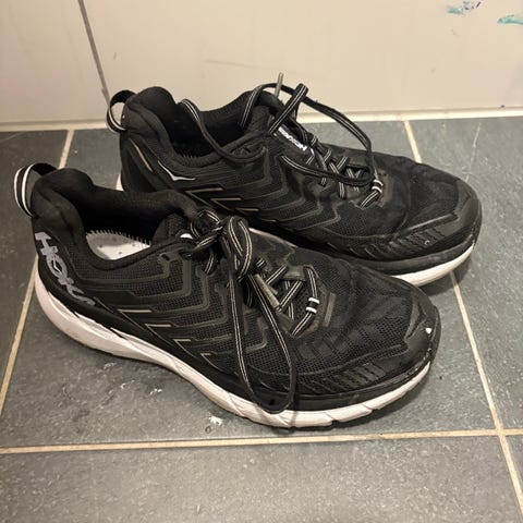 Hoka joggesko i størrelse 37. Modellen er i helsvart farge med snøring foran. Overdelen er i tekstil med syntetiske detaljer, og skoene har kraftig mellomsåle for demping. Passer til hverdagsbruk og lett trening som gåturer og jogging på hardt underlag.