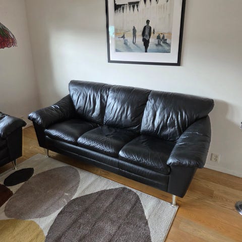 Pent brukt skinnsofa, litt dyp i setene, så passer best for " litt yngre folk"
