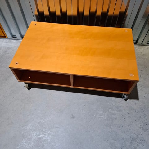 Pent hvitt salongbord, i hvit høyglans. Kraftig og tung kvalitet. Står på lite synlige hjul. 20 cm klaring mellom hyllen og topplaten.
