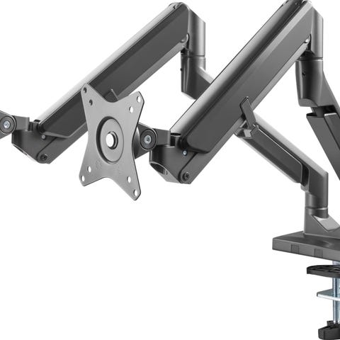 Skjermstativ til flere skjermer i svart metall. Stativet består av en sirkelformet armkonstruksjon med festeplater for skjermer og en vertikal stolpe. Egnet for montering av flere dataskjermer på skrivebord eller lignende arbeidsplass. Leveres med monteringsdeler som vist på bildene. Det er synlige merker og riper på stolpen, noe som tyder på tidligere bruk.