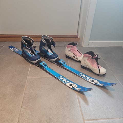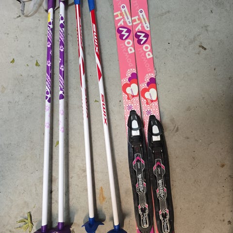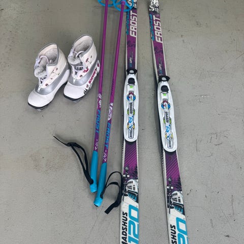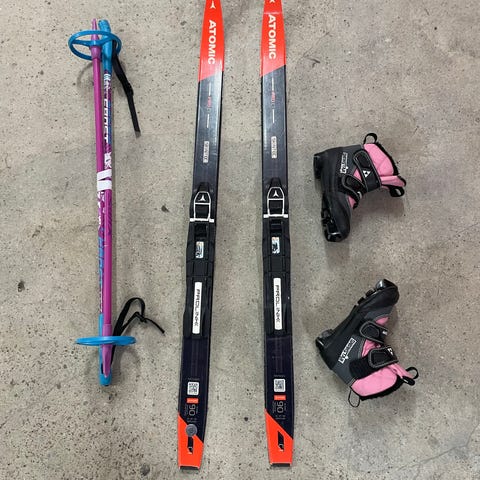 Atomic langrennski for barn med tilhørende Fischer langrennsstøvler i størrelse EU25 og et par staver. Skiene har stålkant og er merket med lengde 90 cm. Støvlene er i syntetisk materiale med borrelåslukking og er tilpasset barn. Sett egnet for klassisk langrenn for barn med matchende ski, sko og staver.
