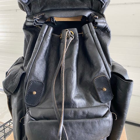 Sekken har snorstramming øverst, klaff med knappelukking og 2 utvendige lommer med glidelås i front. Justerbare skulderreimer i vadmel/lær.