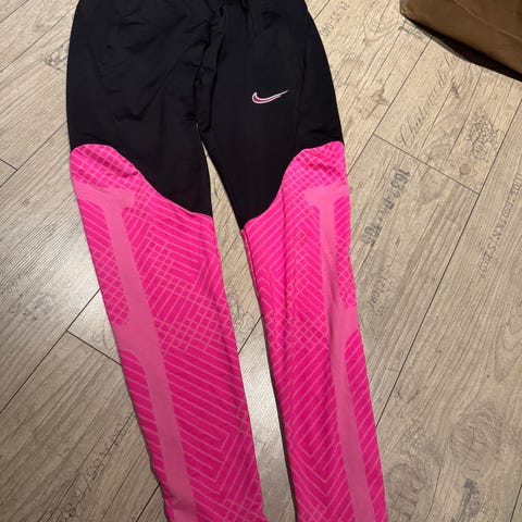 Nike dri fit bukse størrelse S. Den har elastisk linning med strikk, smal passform og glidelås nederst på bena. Perfekt til fotball. Livvidde ca 67 cm (pluss).