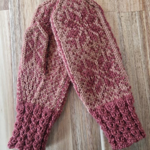 Strikkede ullvotter selges. Strikket I garnet Peer Gynt fra Sandnesgarn.