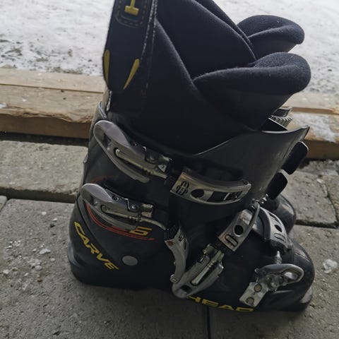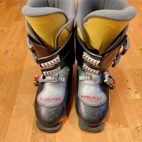 Head alpinstøvler i svart og grå plastskall med fire justerbare spenner i metall. Støvlene har polstret, grå innersko for økt komfort og støtte. Passer til bruk i alpinbakke med vanlige alpinbindinger. Egnet for voksne brukere, kjønn nøytralt design.