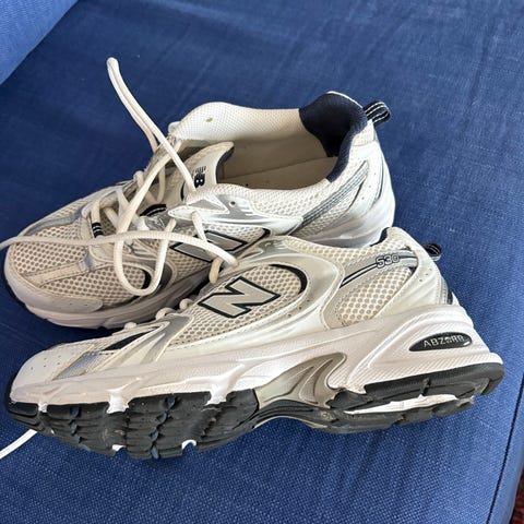 New Balance joggesko i størrelse 40, 5. Skoene er i hvit farge med blå detaljer. Overdelen består av mesh og syntetiske materialer som gir god ventilasjon. Yttersålen er laget for daglig bruk og lett trening. Modellen har snøring for justerbar passform og polstret hælkappe for økt komfort. Passer til hverdagsbruk og ulike former for lett aktivitet.