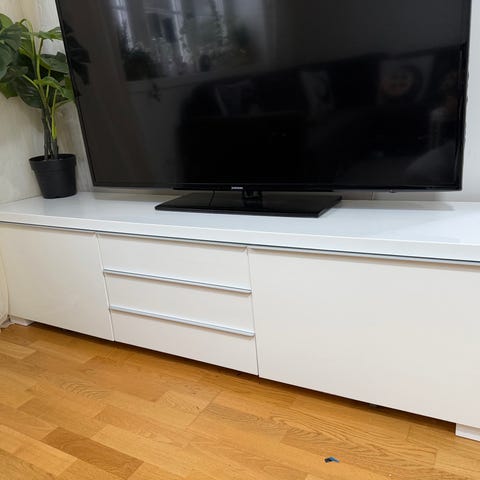 IKEA BYÅS TV-benk. Det er litt bruksmerker på den. Har tatt bilde av de merkene jeg kan se.