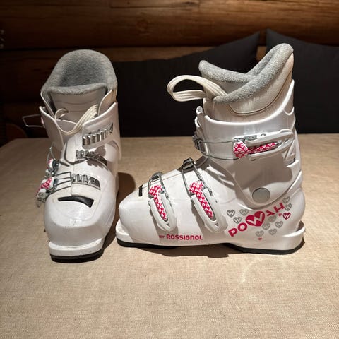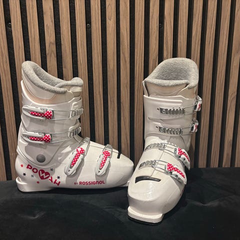 Rossignol Pow Girl alpinstøvler i størrelse 235 mm. Støvlene er hvite med røde og rosa detaljer og fire justerbare spenner i metall. Myk og polstret innersko for bedre komfort. Passer til alpint bruk for barn/unge. Sålelengde merket 235 / 295 mm på hælen. Egner seg til bruk i vanlige alpinbindinger.