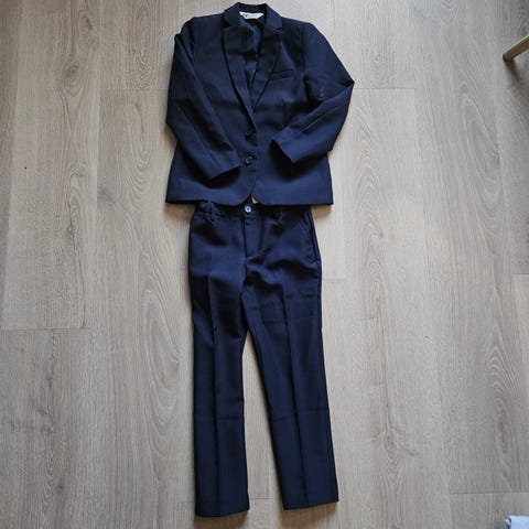 Mørkeblå dress fra H&M i str. 134-140 selges. Dressjakka er i str. 140 og buksa er i str. 134. Det er strikk i livet på buksa. Brukt 2 ganger. Ingen flekker eller skader.