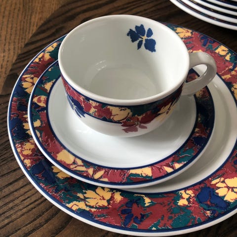 8 asjettet, 8 kopper, 8 tefat og en fløtemugge. Figgjo fajanse.