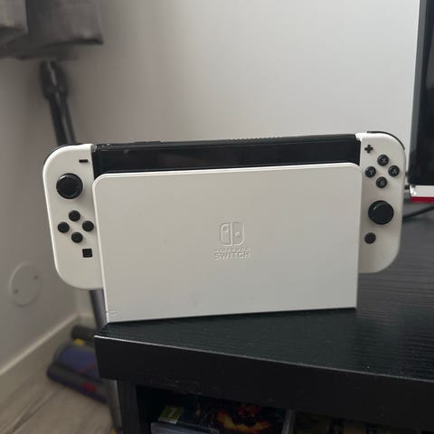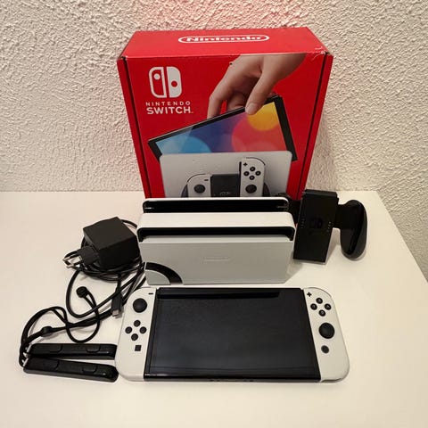 Nintendo Switch OLED spillkonsoll med 7-tommers OLED-skjerm. Konsollen leveres med dokkingstasjon for tilkobling til TV og to Joy-Con-kontrollere i fargene neon rød og neon blå. Kan brukes i TV-modus, bordmodus og håndholdt modus. Fikk den 24.12.25 men må desverre selge ettersom jeg ikke har tid til å bruke den. Kvittering kan sendes og switchen har aldri vært i bruk eller blitt åpnet. Kjøper betaler frakt