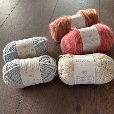 Sandnes Garn Mini Alpakka garn i to farger. Ett nøste i hvit og ett nøste i rosa, samt et ekstra lite hvitt nøste/restegarn. Garnet er i alpakka-kvalitet og egner seg til strikking eller hekling av plagg og tilbehør som for eksempel luer, votter, skjerf eller barneplagg, der man ønsker et mykt og lett resultat.
