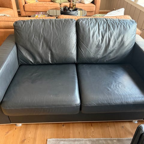 Svart skinnsofa til salgs, kan selges separat eller samlet. Ca 20 år gamle, men holder god stand, usikker hvilket merke, 300kr per sofa. Selges samlet til 600kr. Må hentes.