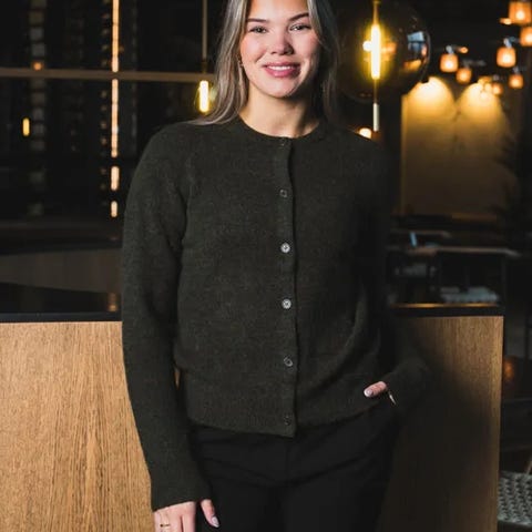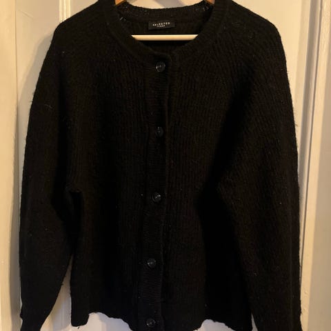 Den populære Lulu-cardiganen fra Selected i kakigrønn. Str XS, men noe stor i størrelsen.