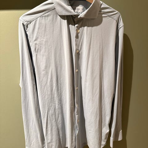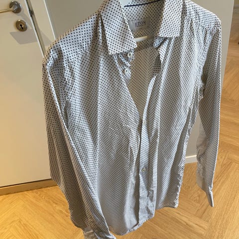 Leter du etter en kvalitetsskjorte som kombinerer tidløst design med moderne snitt? Jeg selger en pent brukt Eton-skjorte i modellen Brighton. Skjorten har en delikat lyseblå farge med et klassisk mønster av små hvite og mørkeblå prikker.