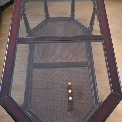 Gir bort et unikt og sjarmerende salongbord med en flott åttekantet form. Bordet har en treramme i en fin gråtonet farge, med to integrerte glassplater i bordplaten som gir et lett og elegant uttrykk.