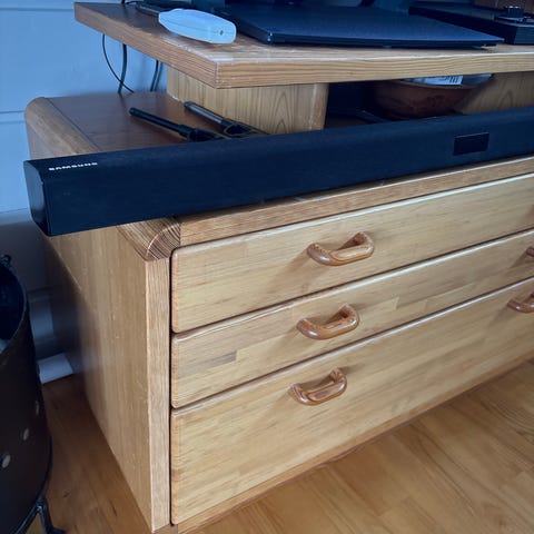 Samsung lydplanke med tilhørende subwoofer i svart. Systemet består av en lang, slank lydplanke for plassering foran TV samt en separat subwoofer for dypere bass. Passer til bruk sammen med TV for forbedret lyd ved film, serier, musikk og spill.