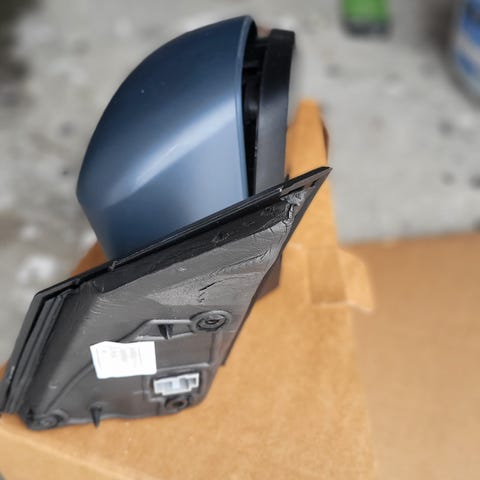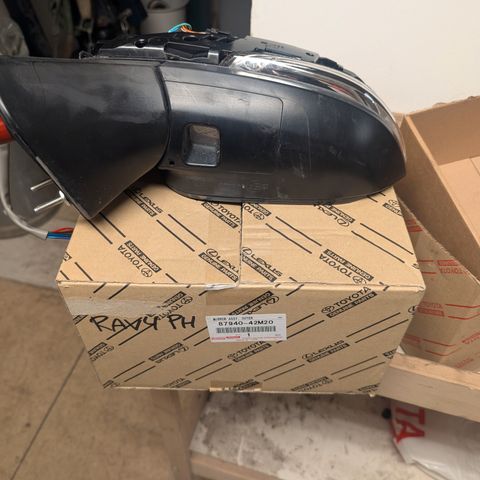 Toyota Carina II speil Høyre svart plast. Originalt Toyota reservedel levert i eske merket Carina II 85-modell. Speilet er beregnet for montering på høyre side av bilen og inkluderer speilhuset med speilglass og feste mot dør/karosseri. Egnet som erstatningsdel for tilsvarende speil på Toyota Carina II der originalt speil er skadet eller mangler.