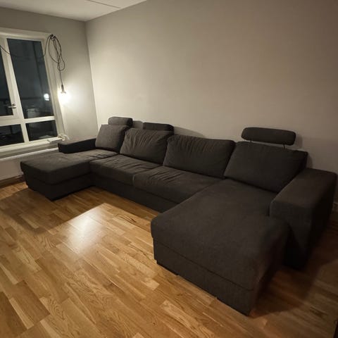 Selger en stor og komfortabel hjørnesofa i lys beige stoff. Sofaen er god å sitte i og har en fin, myk form som passer godt i stuen.