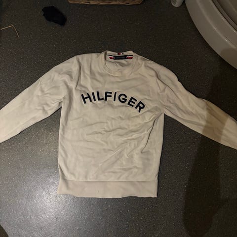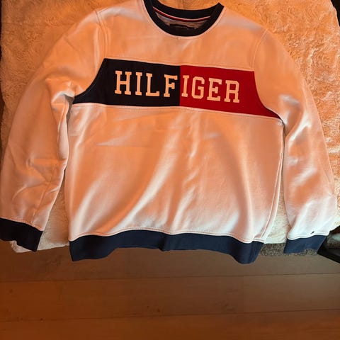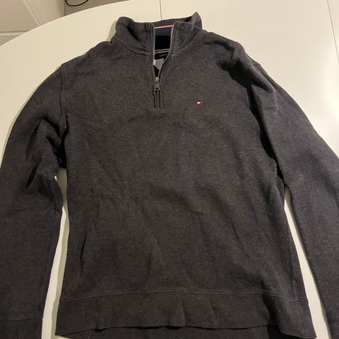 Tommy Hilfiger genser for herre i størrelse S. Genseren er blå og laget av bomull. Modellen har høy hals med glidelås (half-zip) og ribbestrikkede kanter på ermer og nederkant. Liten Tommy Hilfiger-logo på brystet. Passer til hverdagsbruk og kan brukes alene eller over en T-skjorte eller skjorte.