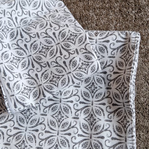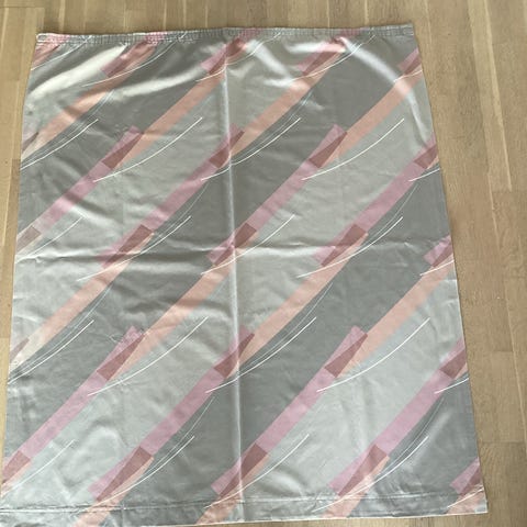 2 hjemmesydde gardinlengder, et mønster i duse pastellfarger, med rynkebånd. Gardinene er fra ca år 2000, men langt fra brukt alle årene. Fremstår derfor i god stand.