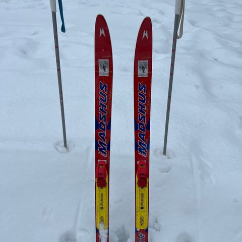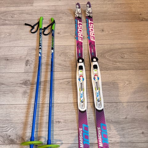 Madshus barneski i blå farge. Skiene har motiv og tekst på oversiden og strukturert såle. Egnet for barn til lek og enkel skigåing. Leveres med tilhørende skistaver som passer til barn.