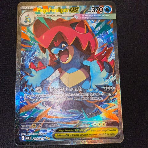 Mega Feraligatr ex 274/217 SIR fra nye Ascended Heroes. Kortet er pack fresh og lagt i sleeve + toploader. Kjøper betaler frakt.