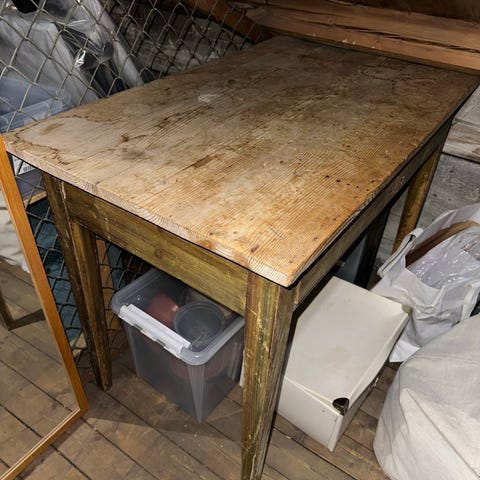 Pent og nett klaffebord med to klaffer som kan benyttes uavhengig av hverandre. Bordet har en liten skuff på den ene kortsiden. Klaffene heller lett nedover når de er slått opp, kan nok løses enkelt med å feste på noen trefliser om man ønsker det. Bærer selvfølgelig preg av bruk siden det er ubehandlet tre, fin pastina! Om jeg husker rett måler bordet 100 cm på diagonalen når det er full oppslått, så det er veldig plasseffektivt! Kan legge ved nøyaktige mål senere hvis ønskelig. Må hentes ved Sagene skole (5. etg uten heis, kan bistå med å bære det ned).