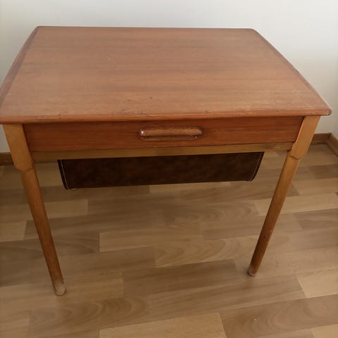 Sidebord/nattbord med treplate og metall understell, beina går på kryss under