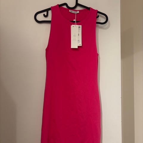 Zara sommerkjole for dame i størrelse M. Kjolen er rosa og laget i bomull. Den har tynne stropper og rett, enkel fasong. Passer som lett sommerkjole eller til hverdagsbruk.