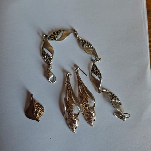 Pilgrim smykkesett for dame bestående av halskjede, armbånd og øredobber i gullbelagt materiale. Halskjedet har ledd med utskårne blad- og vingelignende former. Øredobbene er små hengende modeller med tilsvarende dekor. Smykkene er gullfargede og laget i gullbelagt metall. Settet passer til bruk til hverdags eller ved mer pyntede anledninger.