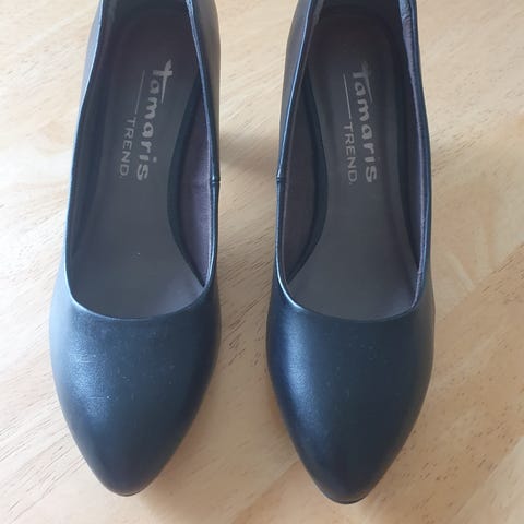 Tamaris pumps hæler i størrelse 39. Klassiske, svarte hæler med avrundet tå. Overdel i glatt materiale med enkel og tidløs utforming. Såle med lett mønster for bedre grep. Passer til bruk ved formelle anledninger, jobb eller hverdagsbruk der pene sko ønskes.